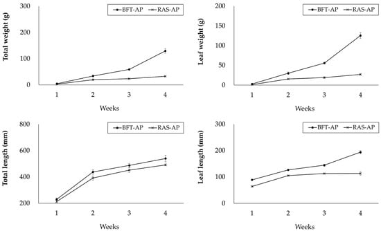 Growth performance of caipira lettuce (L. sativa) in BFT-AP and RAS-AP for 4 weeks. Values are presented mean ± SD of three subsample plant bed within each shared system (system = 1). No inferential statistical tests were performed due to the shared system structure.