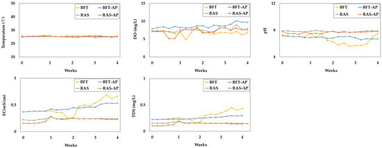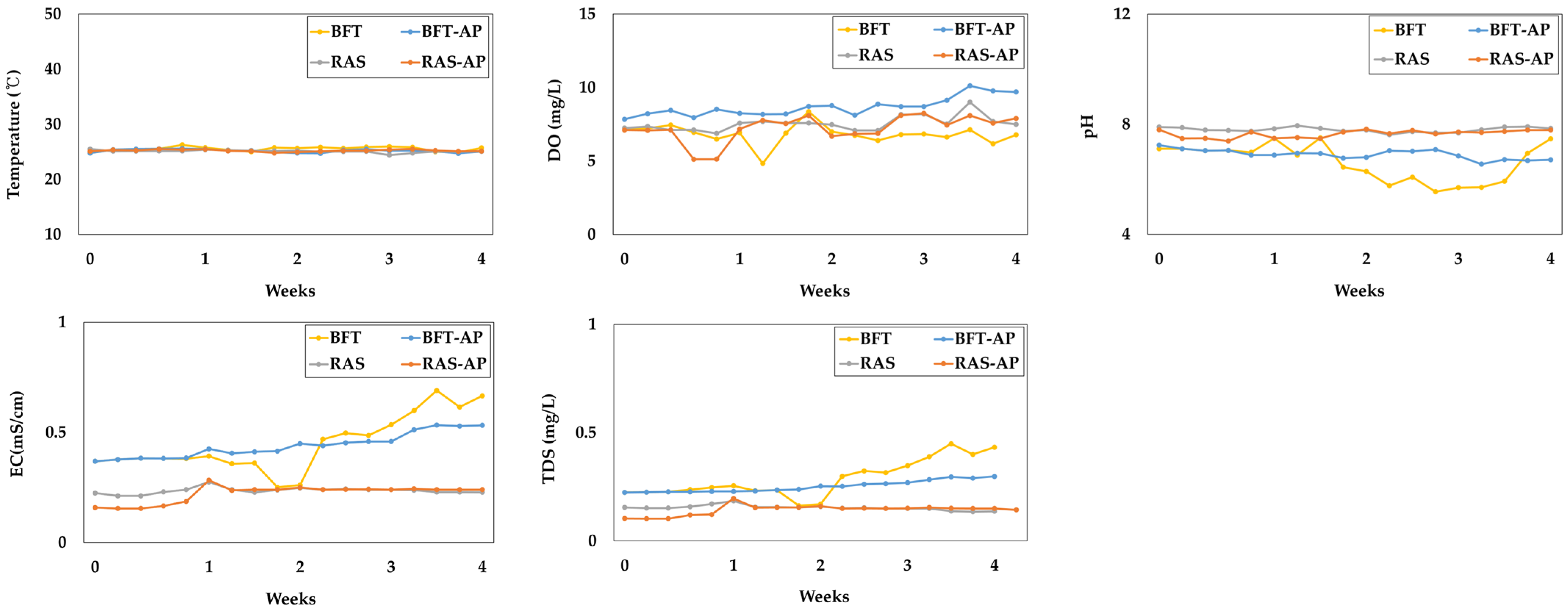 The variation in basic water quality parameters such as, temperature, dissolved oxygen (DO), pH, electrical conductivitiy (EC), total dissolved solids (TDS) were presented in Figure 5. The basic water parameters for BFT, BFT-AP, RAS, and RAS-AP experimental groups were as follows: