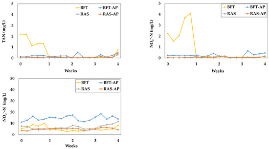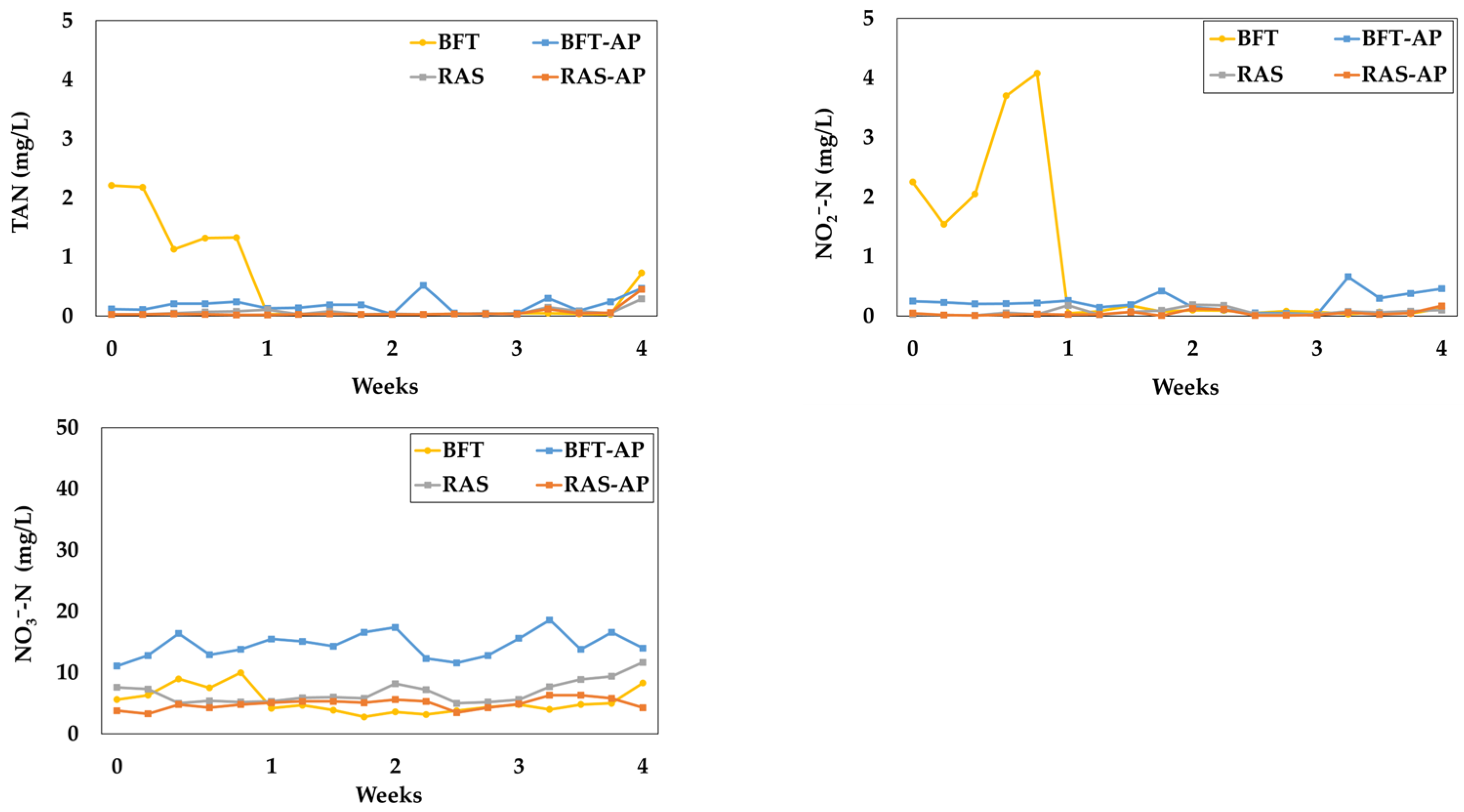 The variation of nitrogen-related water quality parameters such as, total ammonia nitrogen (TAN), NO2−-N and NO3−-N were presented in Figure 6. The nitrogen-related water parameters for BFT, BFT-AP, RAS, and RAS-AP experimental groups were as follows:
