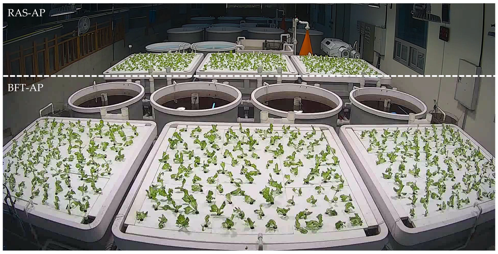 In BFT group, four rearing tanks were operated independently, each with a separate aeration and water circulation system. In RAS and RAS-AP treatments, four rearing tanks shared a common recirculating loop consisting of a drum filter (60 µm), a moving-bed biofilter (40% fill ratio), a UV sterilizer, and an oxygen dissolver. The water turnover rate of RAS was maintained at approximately 1 h−1. In BFT-AP and RAS-AP systems, three plant beds (1.0 m2 each) were connected to the shared loop. Valves were installed to isolate each tank for draining and sampling, but tanks within the same loop were not considered independent replicates. Therefore, data were analyzed descriptively (mean ± SD) (Figure 2 and Figure 3).