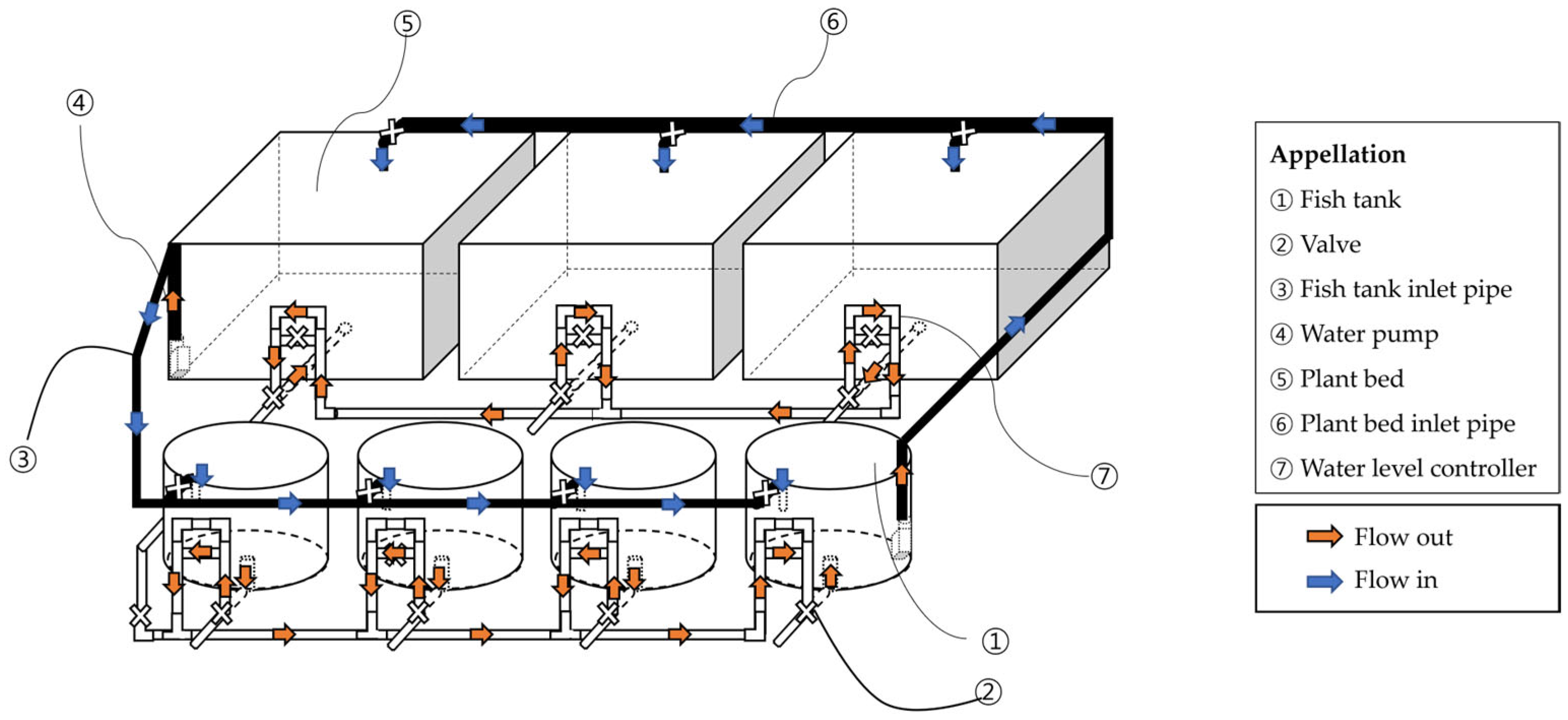 During rearing, the carbon-to-nitrogen (C/N) ratio in BFT and BFT-AP systems was maintained at 15:1. Both systems were strongly aerated to prevent biofloc sedimentation and solids using an air blower (Hi-blow HP-80, Techno Takatsuki Co., Ltd., Osaka, Japan) and a 25 W water pump (Hyupsin, Seoul, Republic of Korea). Additional oxygen was supplied using an oxygen generator (KMOS-40Rl, Kumho Marine, Busan, Republic of Korea). Each plant bed received gentle aeration to prevent floc accumulation around the roots. The water flow rate from fish tanks to plant beds was adjusted to two complete cycles per day. No water exchange was performed during the entire experimental period in any system (BFT, BFT-AP, RAS, or RAS-AP).