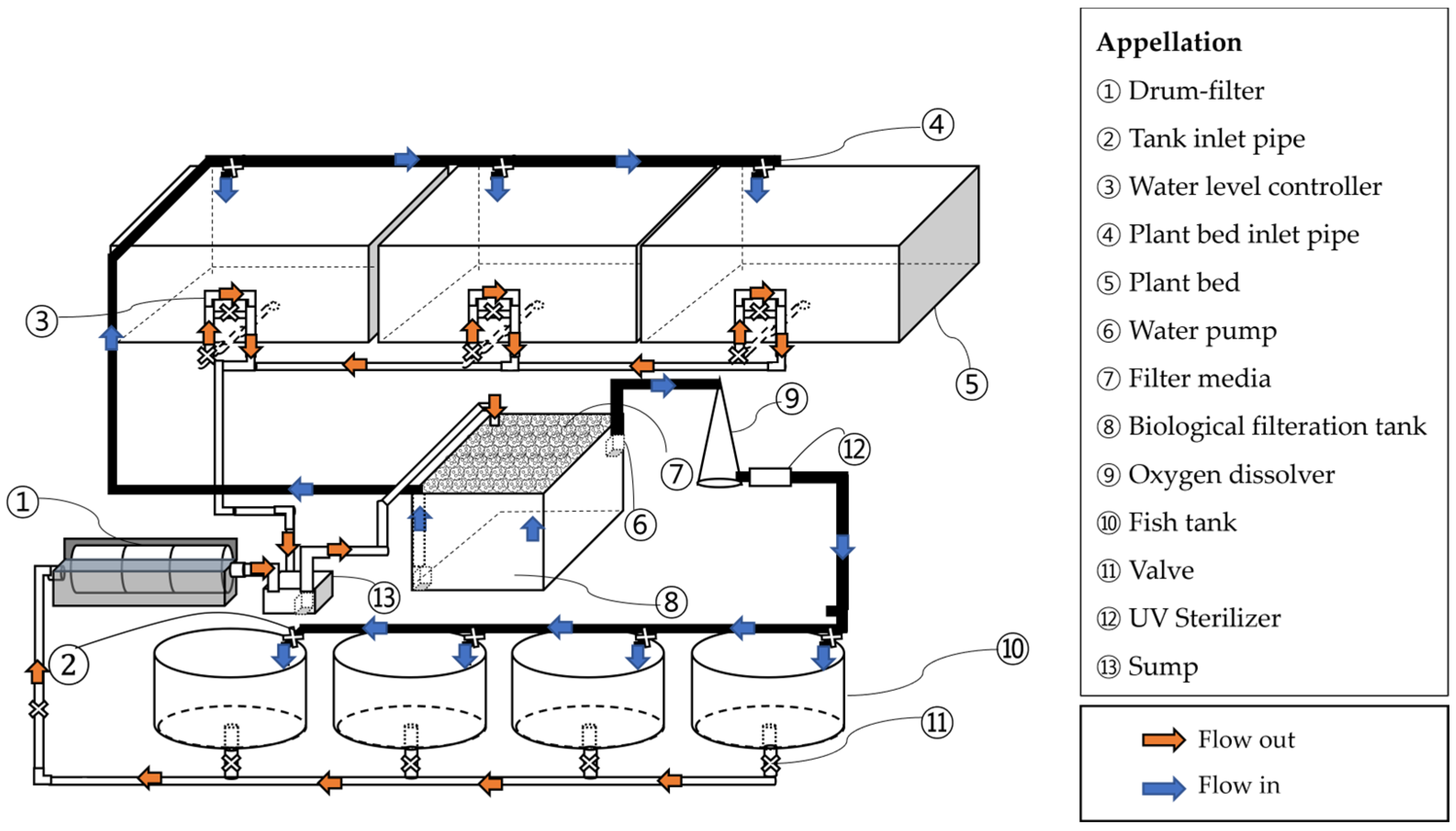 - Hwang, J.; Park, J.S.; Jeong, H.S.; Kim, H.; Oh, S. Productivity of fish and crop growth and characteristics of bacterial communities in the FLOCponics System. Fishes 2023, 8, 422. [Google Scholar] [CrossRef]