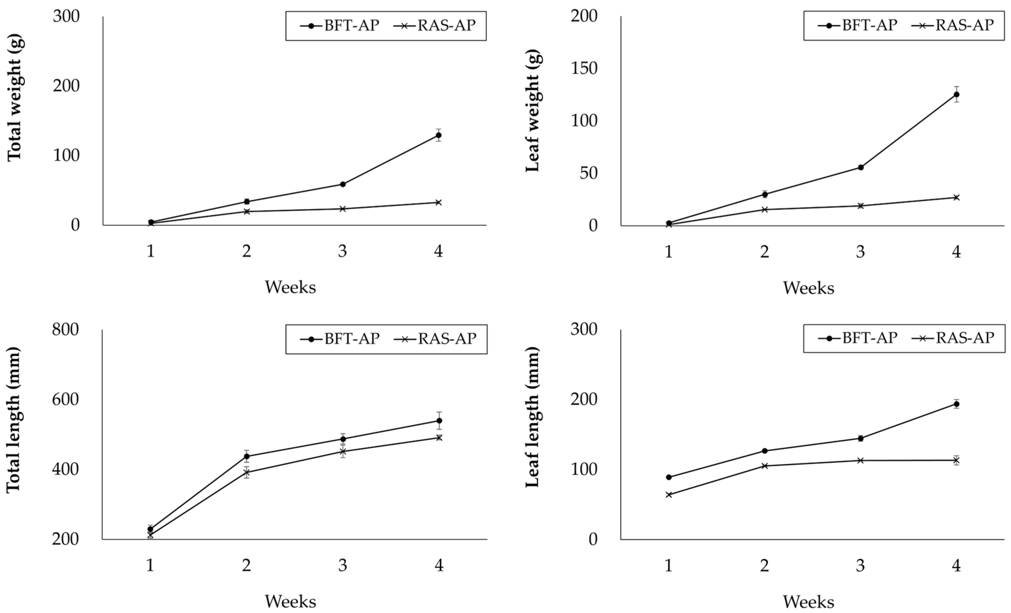 Figure 4 presents the growth performance of caipira lettuce in BFT-AP and RAS-AP during the 4-week trial. The mean total weight and leaf weight of caipira lettuce were higher in BFT-AP group. Total weight of caipira lettuce rearing in BFT-AP and RAS-AP were 129.4 ± 8.8 g and 32.6 ± 1.7 g, respectively. Leaf weight of caipira lettuce rearing in BFT-AP and RAS-AP were 125.5 ± 7.4 g and 27.1 ± 1.5 g, respectively.