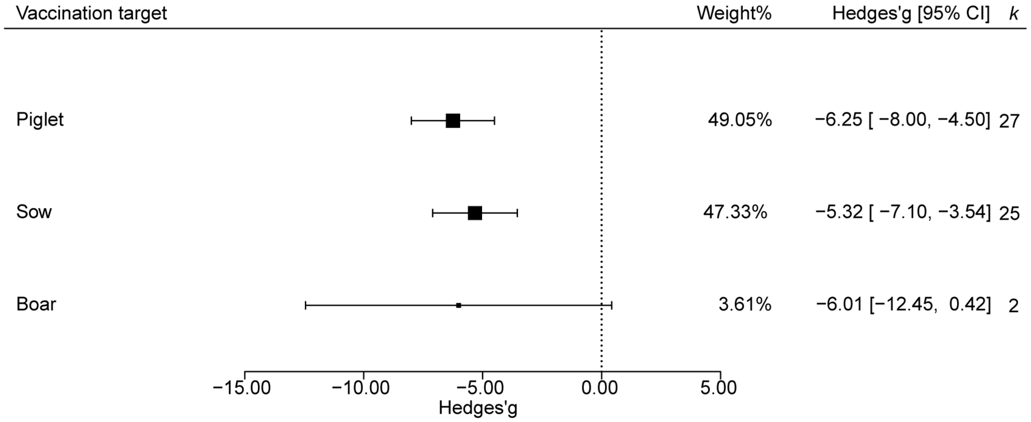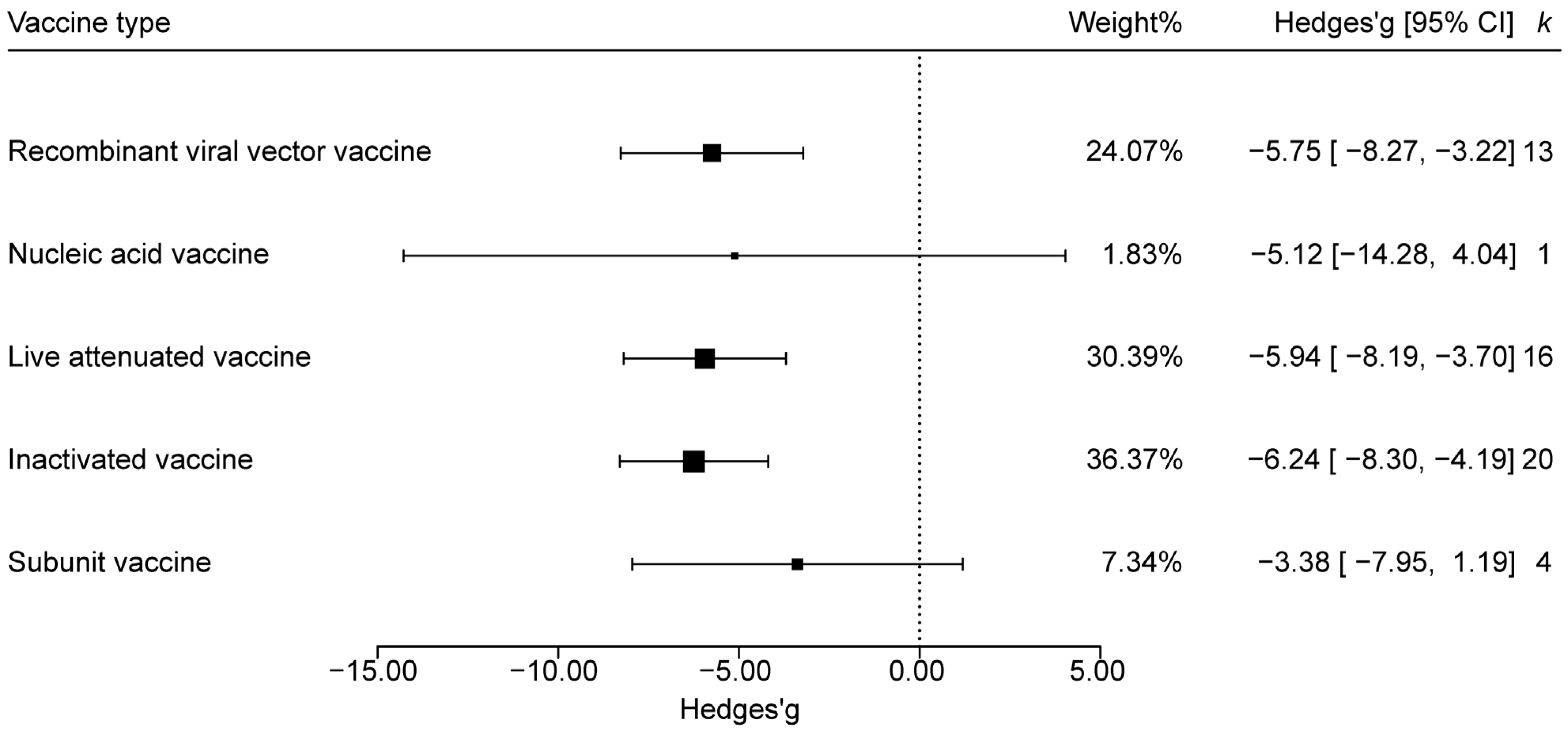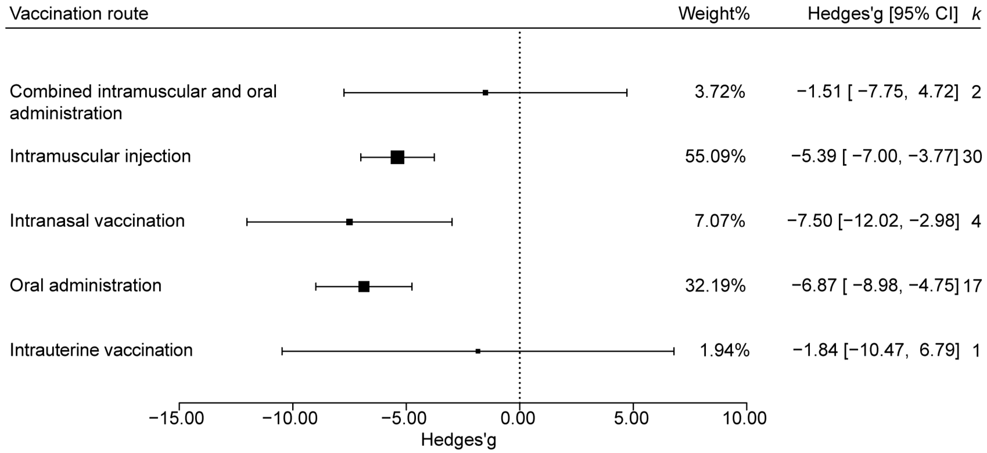 3.2. Meta-Analysis of PEDV Vaccines Efficacy