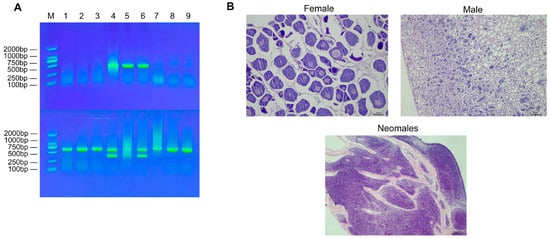 Schematic diagram for identification of genetic sex and physiological sex in E. lucius. (A) 1% agarose gel electrophoresis for male and female genotyping of E. lucius. Note: M: DNA marker; Upper row: 1–3: females; 4–6: males; 7–9: neomales.; Lower row: duplicate detection of the samples in the upper row. (B) Gonad sections of female, male, and neomale fish.