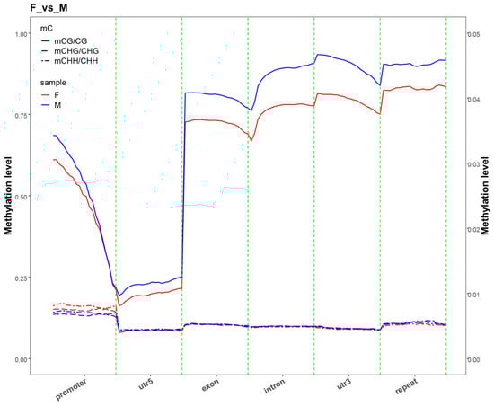 A total of approximately 3745 million cytosine sites were identified in the genome, among which mCs accounted for an average of 7.10% (Table 2). Among all cytosine site types, the methylation rate of CG sites was the highest, representing over 80% of total mCs, followed by CHG and CHH sites. It can thus be concluded that genomic methylation in individuals of all sexes primarily occurs at CG sites. The statistical results revealed that the number of 5mCs was relatively small compared to the total number of cytosines in the whole genome. Among the three groups, the genomic DNA methylation level of neomales was higher than that of females and similar to that of males. The genomic DNA methylation levels of the nine samples ranged from 6.42% to 7.47%. Additionally, the statistical results indicated that 5mCs had the highest proportion in CG sequences, while their proportions in CHG and CHH sequences were relatively low, with average proportions of 0.49% and 0.49% across the nine samples, respectively (Table 2). Therefore, subsequent analyses focused solely on CpG sites.