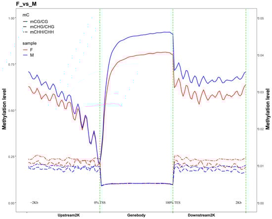 For whole-gene regions (Figure 4B and Figure S4B), the F_vs._M comparison demonstrated 4203, 71, and 161 DMRs unique to the CG, CHG, and CHH contexts, respectively; 50 DMRs were shared between the CG and CHG contexts, 189 DMRs between the CG and CHH contexts, 7 DMRs between the CHH and CHG contexts, and 5 DMRs were shared among all three contexts. The F_vs._NM comparison found 4188, 77, and 170 DMRs unique to the CG, CHG, and CHH contexts, respectively; 51 DMRs were shared between the CG and CHG contexts, 167 DMRs between the CG and CHH contexts, 9 DMRs between the CHH and CHG contexts, and 16 DMRs were shared among all three contexts. For the M_vs._NM comparison, there were 2898, 101, and 220 DMRs unique to the CG, CHG, and CHH contexts, respectively; 34 DMRs were shared between the CG and CHG contexts, 126 DMRs between the CG and CHH contexts, 3 DMRs between the CHH and CHG contexts, and 9 DMRs were shared among all three contexts.