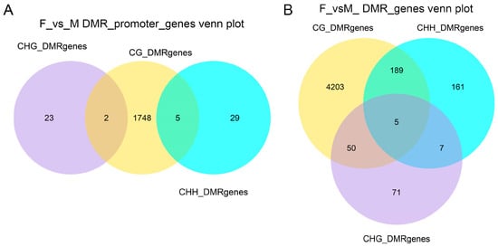 Venn diagrams of genes associated with differentially methylated regions (DMRs). (A) Genes with DMRs located anywhere across the whole structural gene (from TSS to TES). (B) Genes with DMRs specifically located within their promoter regions.