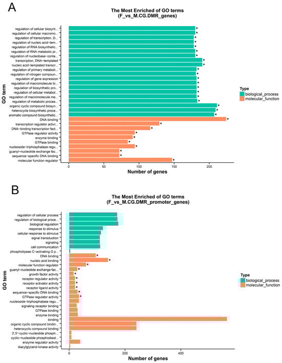 Gene Ontology (GO) enrichment analysis. * Corrected p-value < 0.05. (A) F vs. M. CG.DMR_genes; (B) F vs. M. CG.DMR_promoter_genes.