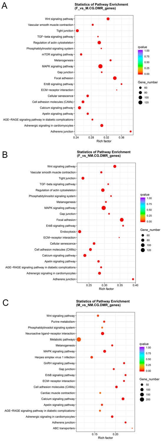 Scatter plots of KEGG pathway enrichment analysis for CG.DMR_genes in E. lucius among three sex combinations. Note: (A) female vs. male (F vs. M); (B) female vs. neomale (F vs. NM); (C) male vs. neomale (M vs. NM).