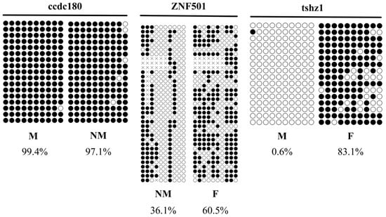 Differentially methylated genes (DMGs) were randomly selected for validation using genome-wide methylation data. Three genes (ccdc180, ZNF501, and tshz1) were selected for BSP (bisulfite sequencing PCR) validation. The methylation level of ccdc180 DMR in the M group was significantly lower than that in the NM group, with a methylation difference of approximately 18.0%. The methylation level of ZNF501 DMR in the F group was significantly higher than that in the NM group (p < 0.05), with a methylation difference of about 50.3%. The methylation level of tshz1 DMR in the F group was significantly higher than that in the M group, with a methylation difference of approximately 82.9%. In the BSP sequencing results, the trend in methylation levels was consistent with the WGBS data (Table 4 and Figure 7).