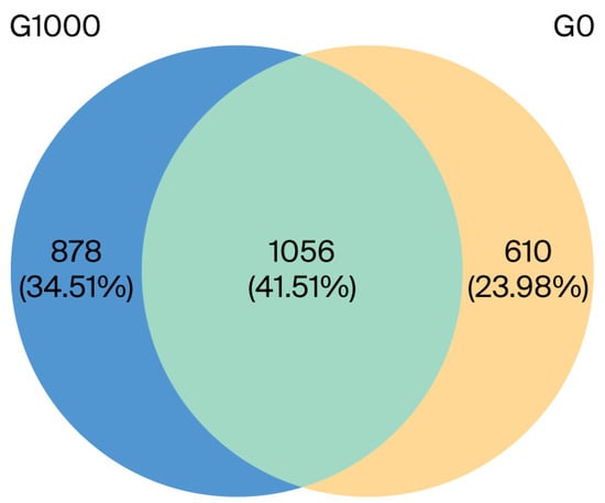 There were 1056 common OTUs in the G0 and G1000 groups, accounting for 41.51% of the total. The independent OTUs were 610 and 878 in the G0 and G1000 groups, respectively (Figure 1). The diversity and richness of the intestinal flora were assessed using the α-diversity index. The PD_whole_tree was significantly higher in the G1000 group than in the G0 group (p < 0.05) (Figure 2C).