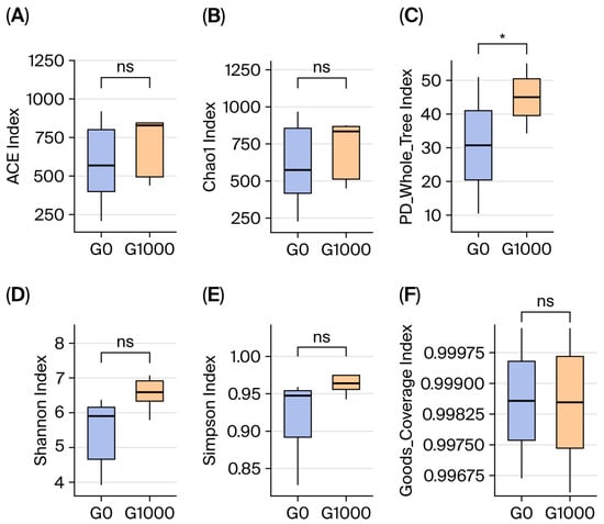 Effect of dietary green tea on intestinal microbiota diversity of grass carp (n = 4). Note: (A) ACE index; (B) Chao 1 index; (C) PD_whole_tree index; (D) Shannon index; (E) Simpson index; (F) Goods_Coverage index. G0: control group; G1000: treatment group. *: Significant difference between two groups at p < 0.05; ns: no significant difference between two groups at p > 0.05.