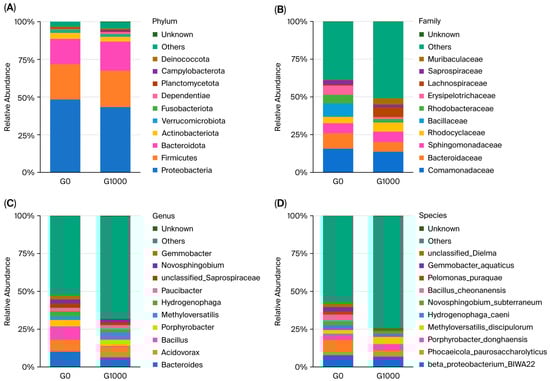 Analysis of dominant flora in the intestine of grass carp (n = 4); each bar represents the average relative abundance of the bacteria. Note: (A) phylum level; (B) family level; (C) genus level; (D) species level. G0: control group; G1000: treatment group.