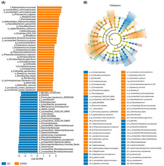 LEfSe analysis of intestinal flora of grass carp (n = 4). Note: LDA score (A) and taxonomic cladogram (B) from LEfSe analysis of 16S sequences (LDA SCORE > 2.5, p < 0.05, Kruskal–Wallis test). The rings represent phylum, class, order, family, genus, and species from inside to outside. G0: control group; G1000: treatment group.