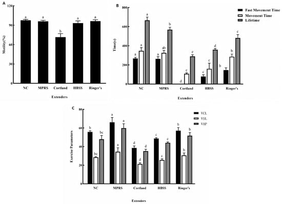 (A) Effects of different diluents on the motility of silver pomfret sperm during cryopreservation. NC: Fresh sperm. (B) Effects of different extenders in cryopreservation on fast movement time, movement time, and lifetime of silver pomfret sperm. (C) Effects of different extenders on sperm kinetic parameters during cryopreservation. The number of biological replicates (males, n = 6); one-way ANOVA; bars represent mean ± SD; different letters indicate significant differences.