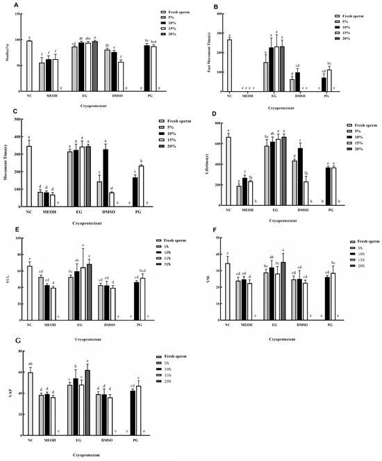 Effects of different cryoprotectants and their concentrations on the preservation of silver pomfret sperm. (A) Sperm motility. (B) Fast movement time. (C) Movement time. (D) Lifetime. (E) VCL. (F) VSL. (G) VAP. Note: NC. Fresh sperm; MEOH. Methanol; EG. Ethylene glycol; DMSO. Dimethyl sulfoxide; PG. Propylene glycol; 5–20% indicates the final concentration of the cryoprotectant; MPRS extender mixed with 20% EG. The number of biological replicates (males, n = 6); one-way ANOVA; bars represent mean ± SD; different letters indicate significant differences. The sperm in the glycerol group all died.