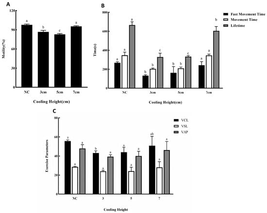 (A) Effects of different cooling height on the motility of silver pomfret sperm during cryopreservation. NC: Fresh sperm. (B) Effects of different cooling height in cryopreservation on fast movement time, movement time, and lifetime of silver pomfret sperm (the black bars in the figure show average fast movement time; the white bars show average movement time; the grey bars show average lifetime). (C) Effects of different extenders on sperm kinetic parameters during cryopreservation. The number of biological replicates (males, n = 6); one-way ANOVA; bars represent mean ± SD; different letters indicate significant differences.