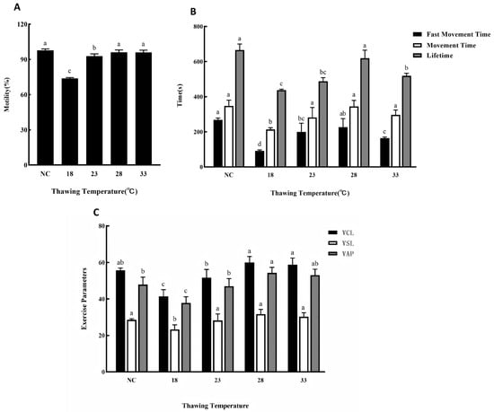 (A) Effects of different thawing temperature on the motility of silver pomfret sperm during cryopreservation. NC: Fresh sperm. (B) Effects of different thawing temperature in cryopreservation on fast movement time, movement time and lifetime of silver pomfret sperm (the black bars in the figure show average fast movement time; the white bars show average movement time; the grey bars show average lifetime). (C) Effects of different extenders on sperm kinetic parameters during cryopreservation. The number of biological replicates (males, n = 6); one-way ANOVA; bars represent mean ± SD; different letters indicate significant differences.