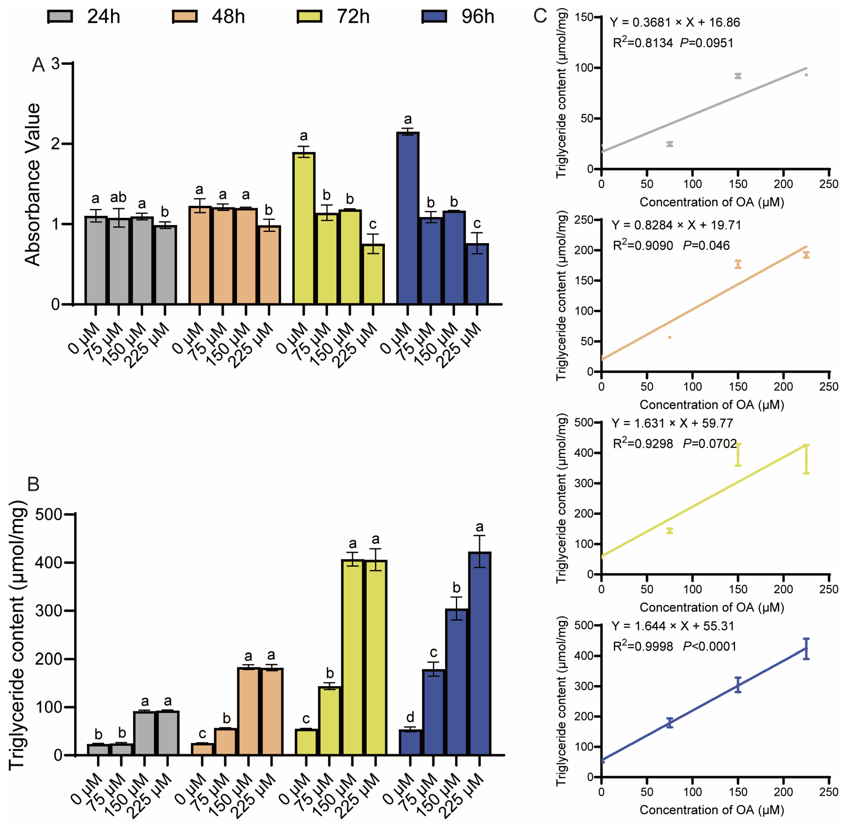 - Song, H.; Yang, R.; Zhang, J.; Sun, P.; Xing, X.; Wang, L.; Sairijima, T.; Hu, Y.; Liu, Y.; Cheng, H.; et al. Oleic Acid-Induced Steatosis Model Establishment in LMH Cells and Its Effect on Lipid Metabolism. Poult. Sci. 2023, 102, 102297. [Google Scholar] [CrossRef] [PubMed]