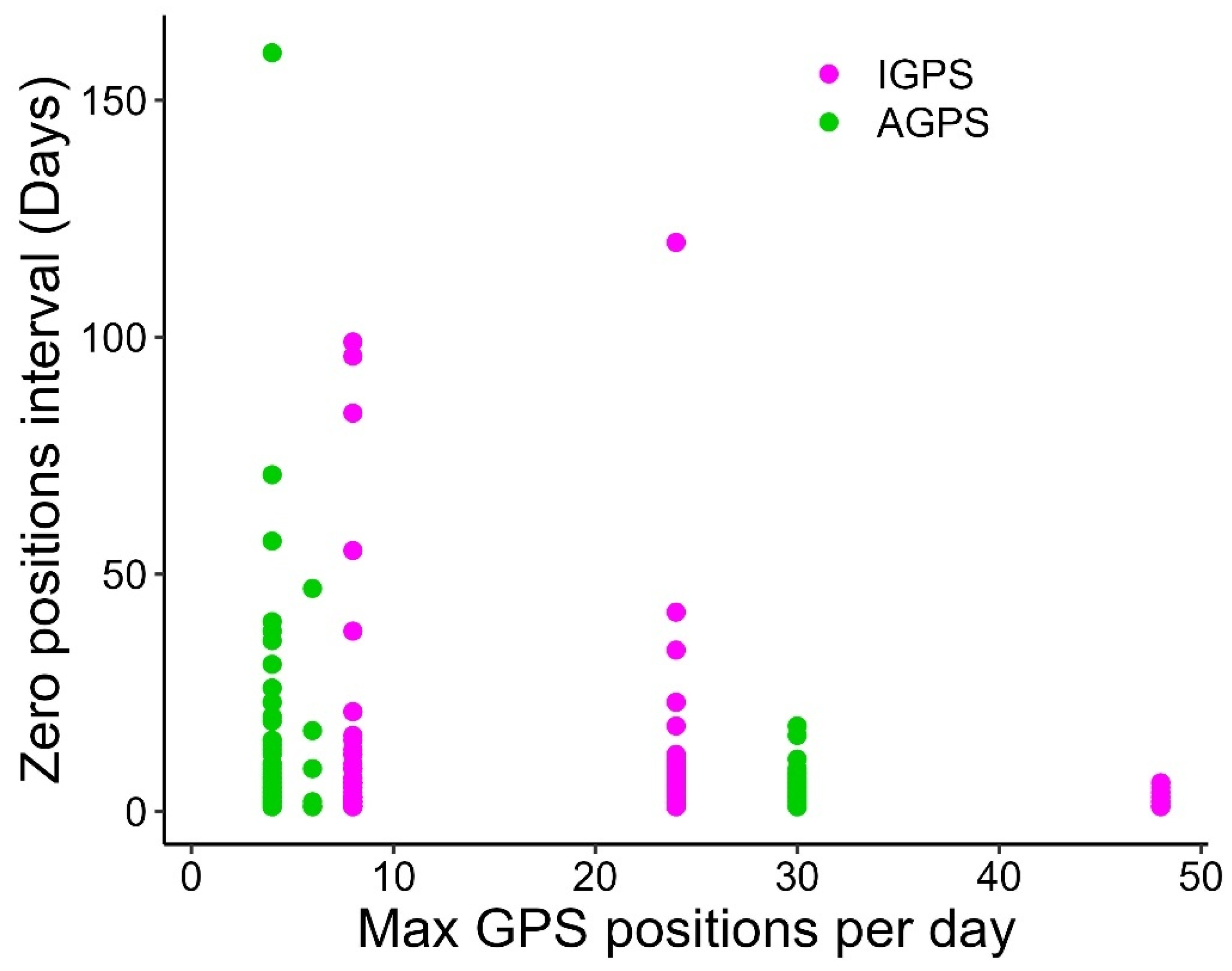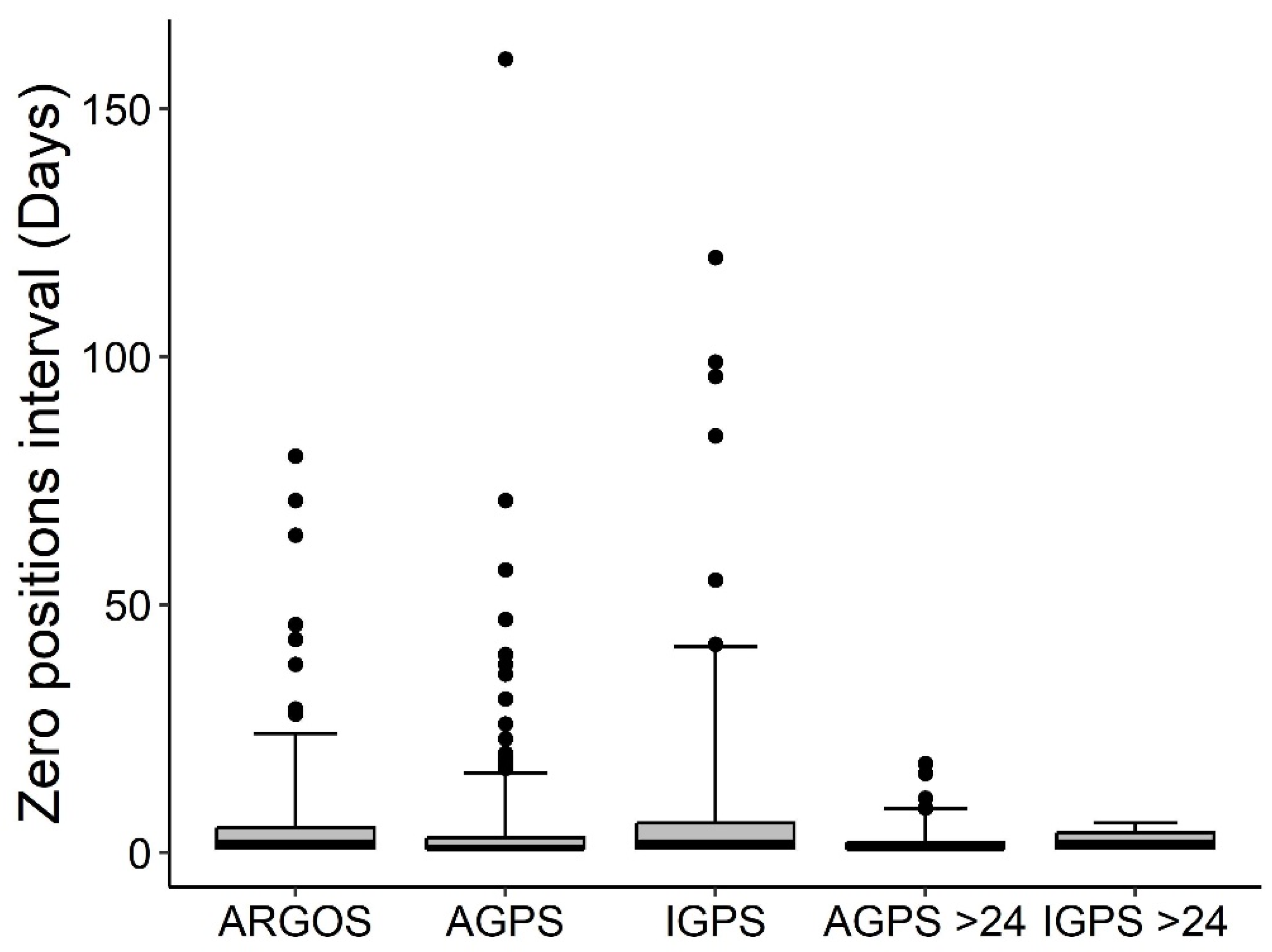 | ARGOS °, ARGOS-GPS, Iridium * | ZPI | ARGOS > ARGOS-GPS | Lk− | I− | − | n/a | n/a | Neg Binomial | 1094 | 0.51 |