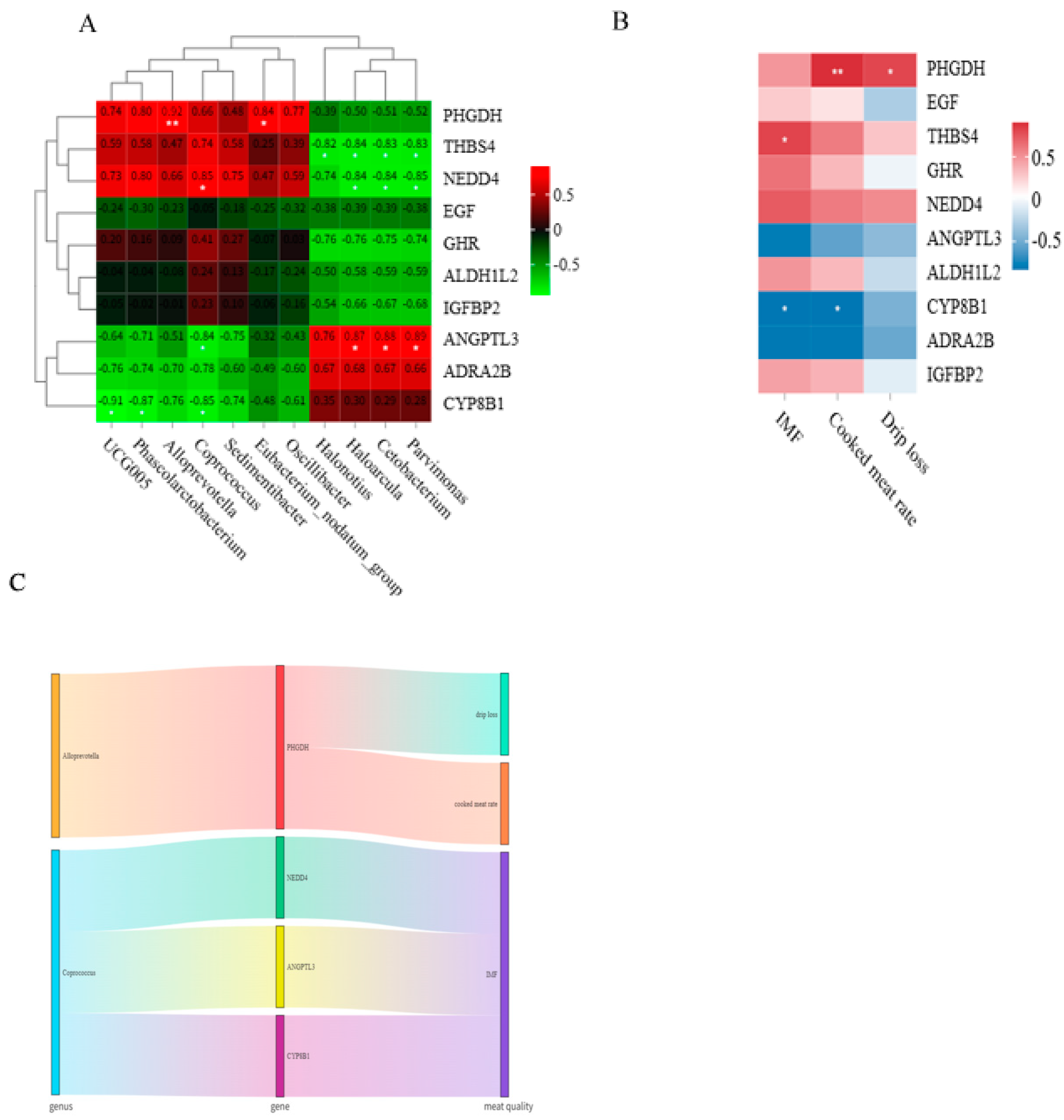 3.6. Regulation Mechanism of Microorganisms on the Meat Quality of Rabbits by Affecting Host Genes