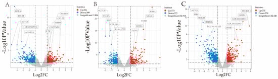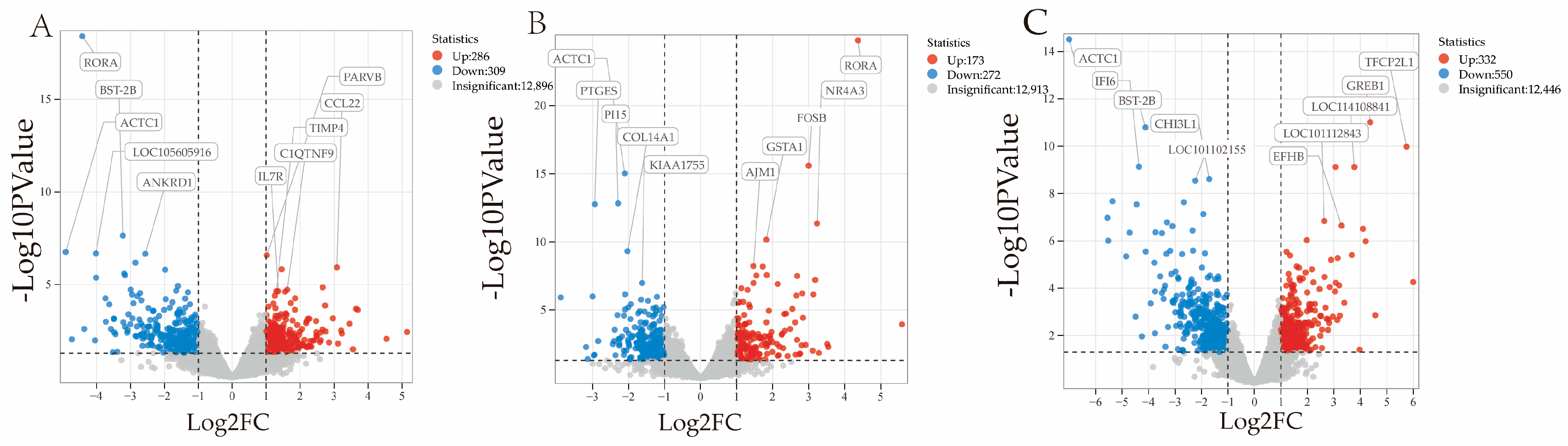 A total of 1395 DEGs were identified in the analysis of nine samples spanning three age groups (Figure 1). In the 3 months vs. 9 months comparison, the top five significantly downregulated genes were RORA, BST-2B, ACTC1, LOC105605916, and ANKRD1, while the top five significantly upregulated genes were PARVB, CCL22, C1QTNF9, TIMP4, and IL7R. In the 9 months vs. 18 months comparison, the top five significantly downregulated genes were ACTC1, PI15, PTGES, COL14A1, and KIAAI755, while the top five significantly upregulated genes were RORA, FOSB, NR4A3, GSTA1, and AJM1. In the 3 months vs. 18 months comparison, the top five significantly downregulated genes were ACTC1, BST-2B, IFI6, CHI3L1, and LOC101102155, while the top five significantly upregulated genes were GREB1, TFCP2L1, LOC1141-8841, LOC101112843, and EFHB (Table 6). An analysis of the identified DEGs is shown through the volcano plots and clusters in Figure 2 and Figure 3.