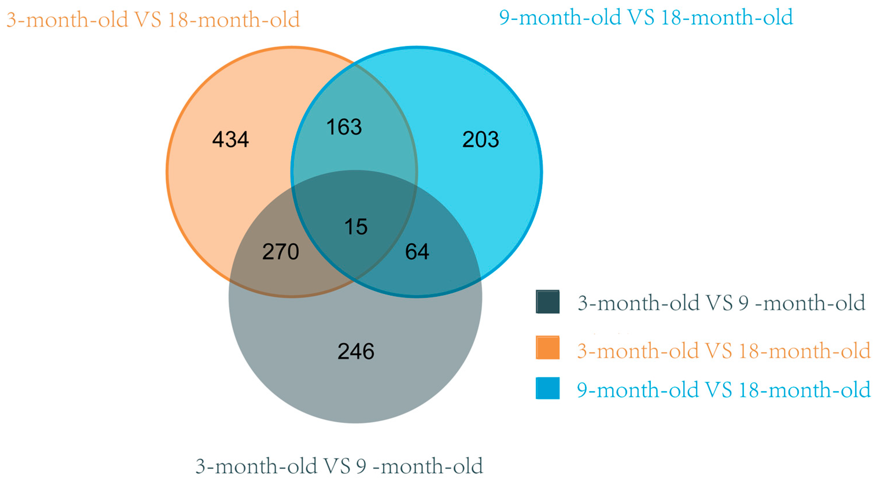 The sample size for statistical analyses varied according to the trait measured: growth traits were evaluated using all 20 biological replicates per age group; slaughter and meat quality traits were assessed using the 12 slaughtered animals (3, 6, and 3 per age group, respectively); and transcriptomic analysis was performed with 3 biological replicates per group for RNA-seq. All statistical analyses were performed using SPSS 26.0 Statistics. Prior to analysis, the normality of the data distribution was verified using the Shapiro–Wilk test, and homogeneity of variances was confirmed using Levene’s test. The qPCR validation result was illustrated using GraphPad Prism 9.5. For comparisons across multiple age groups (3, 9, and 18 months), a one-way analysis of variance (ANOVA) was used, followed by Tukey’s post hoc test for multiple comparisons. The Pearson correlation coefficient was employed to assess the relationships between target gene expression levels and meat quality traits. Correlation p-values were adjusted for multiple testing using the Benjamini–Hochberg false discovery rate (FDR) procedure where applicable. Differences were considered statistically significant at p < 0.05 , and highly significant at p < 0.01 .