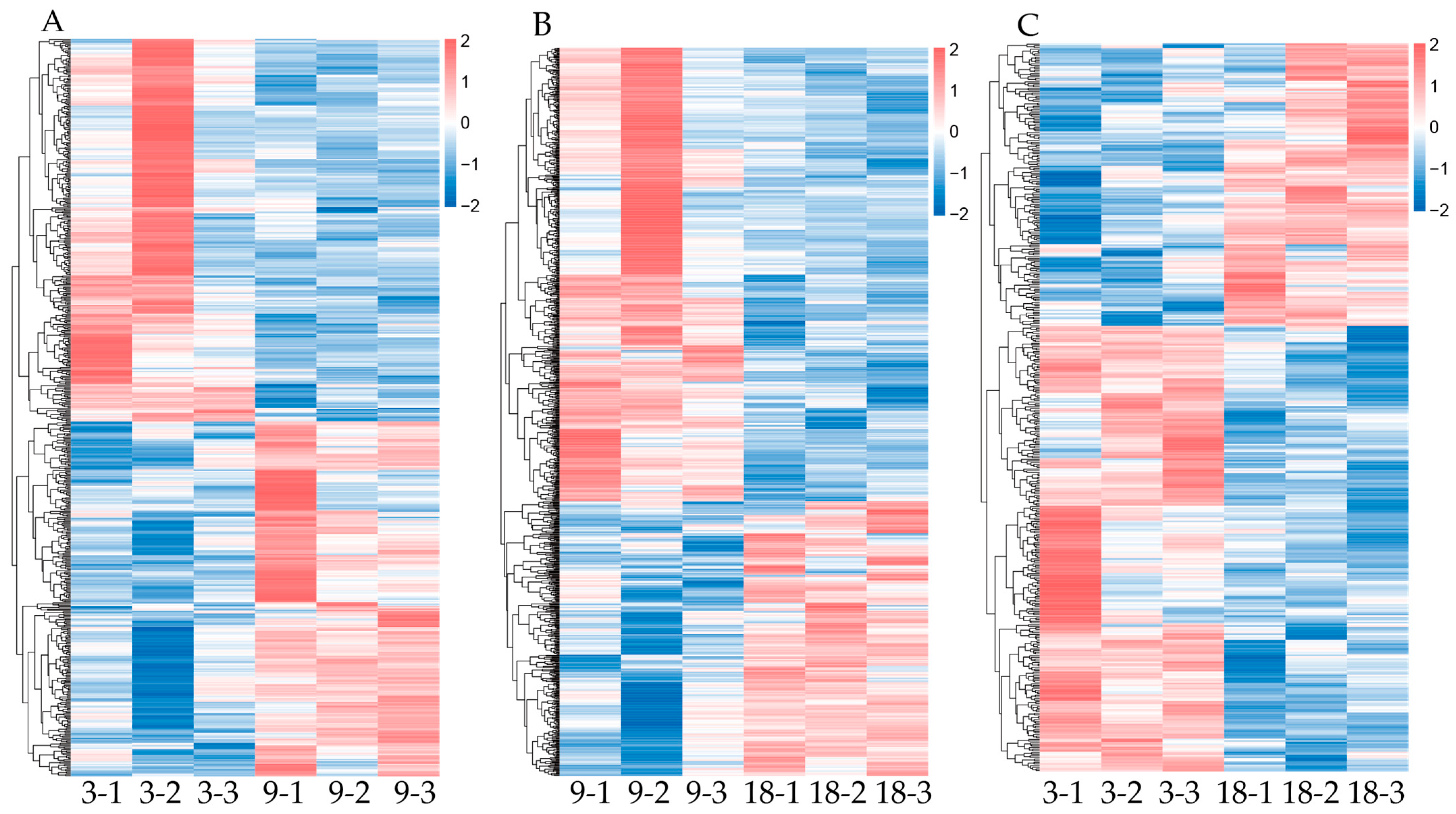 Using the longissimus dorsi tissues of Huanghuai sheep at 3, 9, and 18 months of age as samples, nine cDNA libraries were constructed. Following quality control of the raw sequencing data (Table 5), a total of 214,965,572 raw reads and 211,324,916 clean reads were obtained, with an average of 23,480,546 clean reads per sample and 63.26 Gb of effective bases. The GC content of each sample ranged from 50.14% to 52.34%, with Q30 ≥ 94.25%, indicating high base-calling accuracy. The high-quality sequences were aligned to the sheep reference genome (Oar_v2.0), with alignment rates ranging from 97.25% to 97.90% and an average of 92.22% of sequences being uniquely mapped. These results demonstrate the accuracy and reliability of the transcriptome sequencing data.