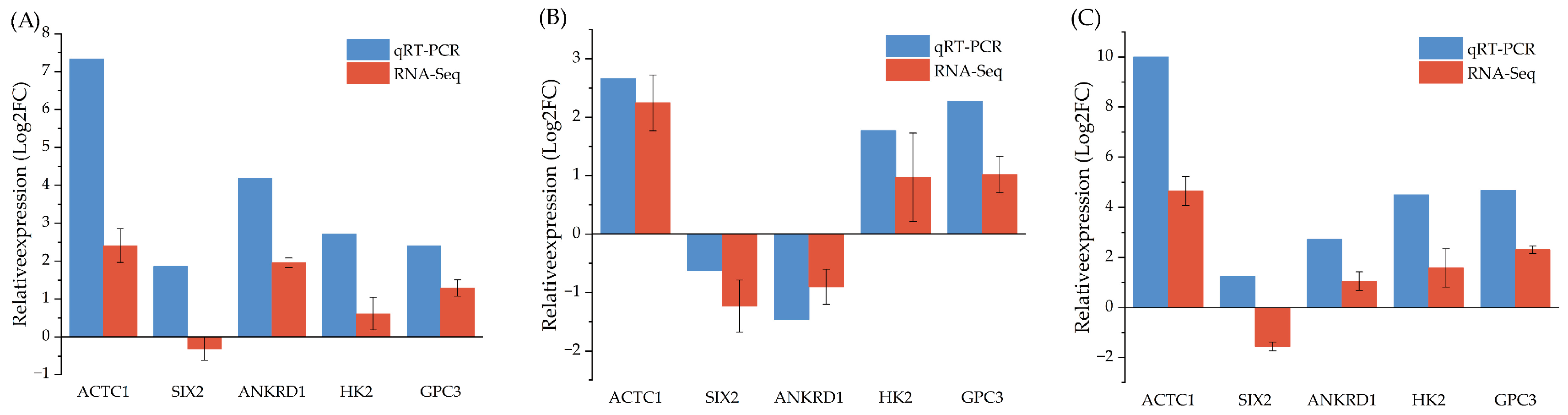 To validate the reliability of the transcriptome data, five DEGs (ACTC1, SIX2, ANKRD1, HK2, and GPC3) were randomly selected for qRT-PCR analysis. The results showed that ACTC1, ANKRD1, HK2, and GPC3 were consistent with the RNA-seq data, whereas the expression of SIX2 was inconsistent (Figure 5).