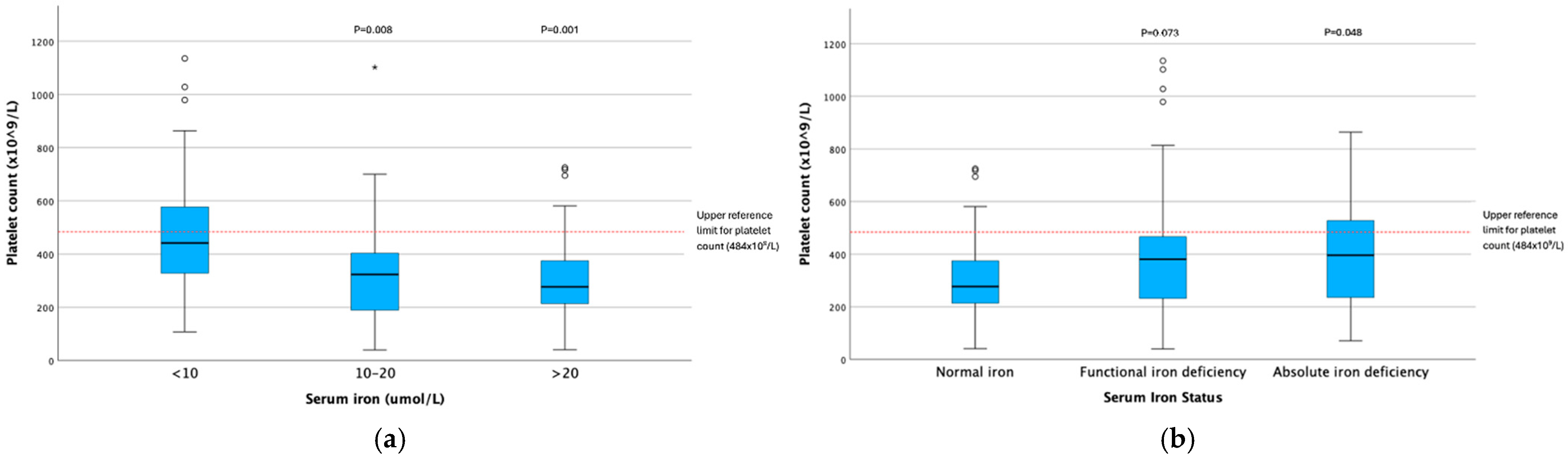 - Evstatiev, R. Iron deficiency, thrombocytosis and thromboembolism. Wien. Med. Wochenschr. 2016, 166, 437–446. [Google Scholar] [CrossRef]