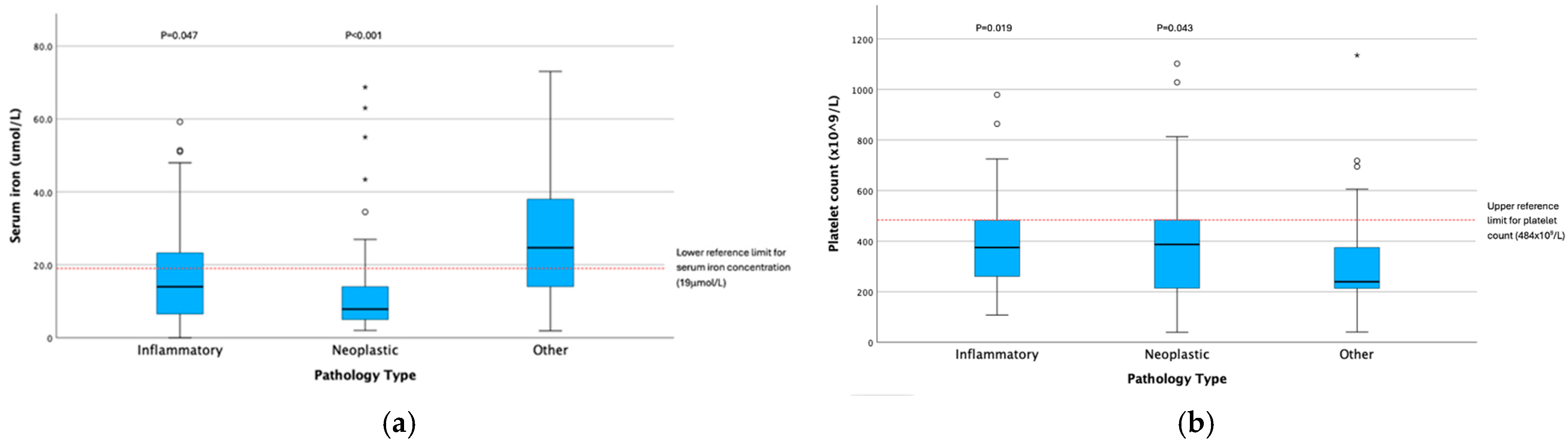 | Pathology type vs. continuous serum iron data | Inflammatory | 7.449 | 2/132 | 0.001 *3 | Inflammatory vs. neoplastic | 3.657 (132) | <0.001 |
