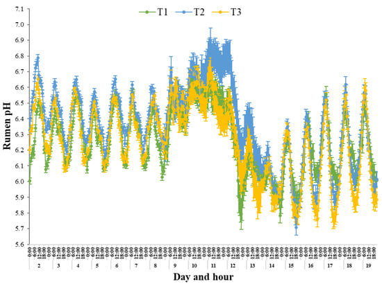 54] found that although differences in daily mean rumen pH were evident for different diets, including differing concentrations of starch, fatty acids and dietary fibre, there was no difference in the daily diurnal pattern of rumen pH. This is in agreement with the current study in that, unlike the T