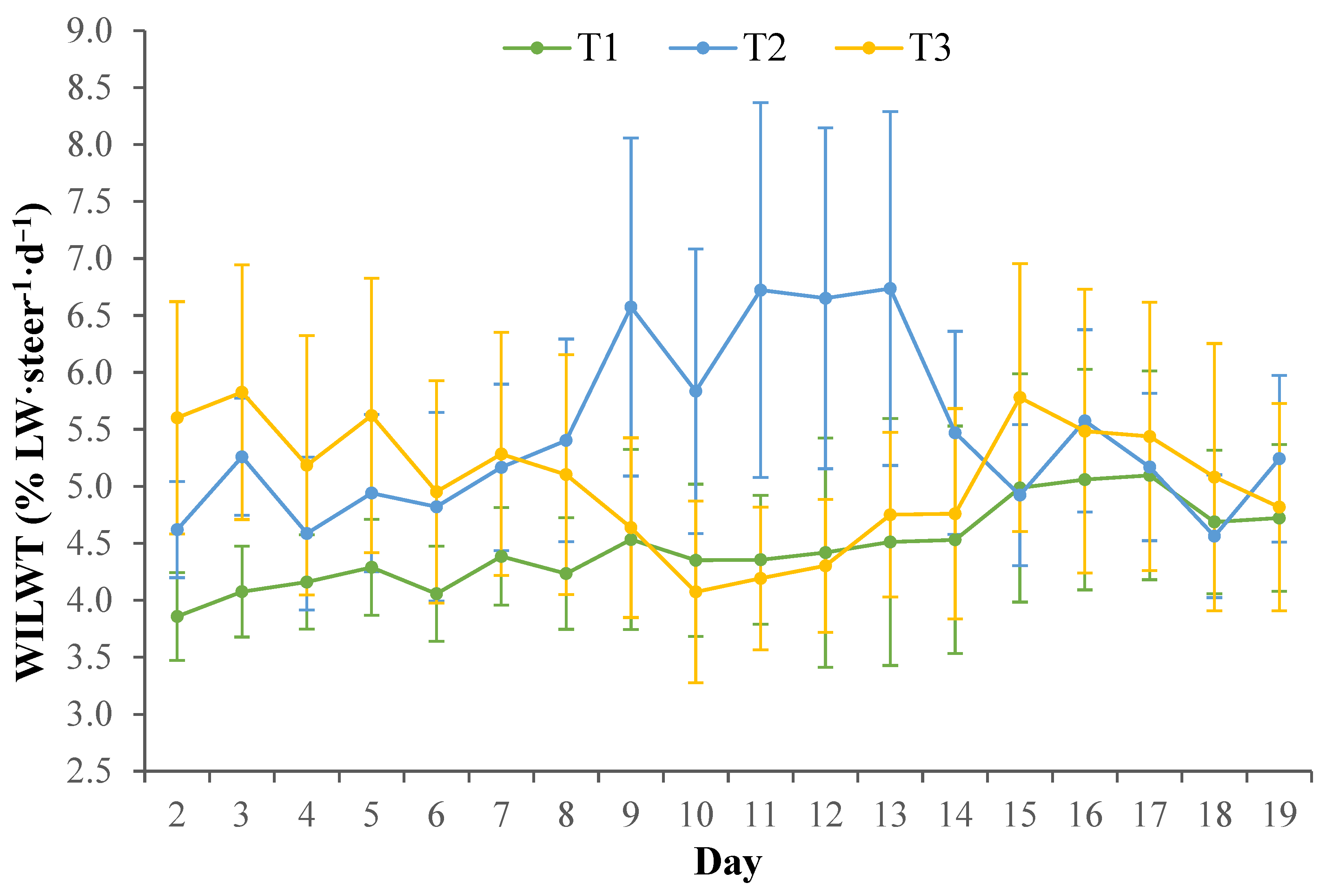 Within the current study, the WILW for T1 and T3 tended to be greater during the heat wave conditions compared to pre-heat wave Phase I and Phase II, despite the heat load conditions increasing in intensity. It can be speculated that the mild heat load conditions during Phase I and Phase II may have influenced WILW, regardless of Treatments, so that WILW was already high due to the steers attempting to regulate their body temperature to facilitate evaporative heat loss and maintain homeostasis while exposed to chronic heat load conditions. This may in part be due to the dramatic decreases in DMILW negating the need for a greater water requirement for digestive processes. In comparison, the WILW for T2 clearly increased during the heat wave conditions compared with mean WILW pre-heat wave. Generally, water intake is primarily driven by dry matter intake and diet type, where previous studies have shown an increase in dry matter intake and diets with a higher roughage content are associated with an increase in water intake [