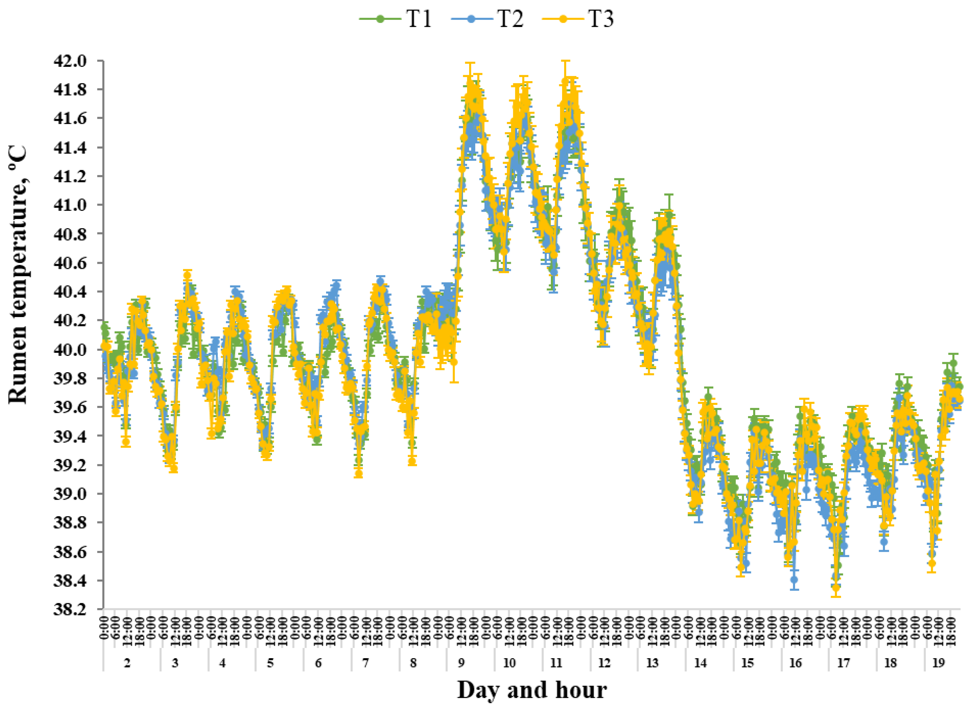 53]. In the current study, rumen pH of all Treatments sharply declined 4 days after the onset of the heat wave conditions, which coincided with a reduction in mean T