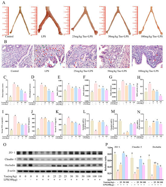 Effects of taurine on pathological injury and inflammation in LPS-induced endometritis in mice. (A) Morphological observation of pathological injury of uterine tissue in mice with endometritis. (B) Pathological injury of the uterine tissue in mice with endometritis was observed with HE staining. Red arrows represented neutrophil infiltration. Purple arrows represented lymphocyte infiltration. Blue arrows represented the shedding of endometrial epithelial cells. Black arrows represented capillary congestion and hemorrhage. Green arrows represented eosinophilic secretory deposits within uterine glands. Orange arrows represented the collapse of the uterine glands. (C,D) Tissue injury scores and histological scores. (E–G) The indices of the organs uterus, spleen, and liver in LPS-induced endometritis in mice. (H) MPO activities. (I–K) Serum levels of inflammatory cytokines TNF-α, IL-1β, and IL-6 in mice. (L–N) Tight junction mRNA expressions of ZO-1, Claudin-3, and Occludin were evaluated with qRT–PCR. (O,P) Illustrative bands and grayscale analysis results of tight junctions ZO-1, Claudin-3, and Occludin. Values were represented as mean ± SEM. No identical letter on top of the bar showed a remarkable difference (p < 0.05).