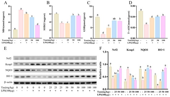 Effects of taurine on the oxidative stress in LPS-induced endometritis in mice. (A–D) The levels of MDA, SOD, GSH, and T-AOC. (E,F) Illustrative bands and grayscale analysis results of Nrf2, Keap1, NQO1, and HO-1. Values were represented as mean ± SEM. No identical letter on top of the bar showed a remarkable difference (p < 0.05).