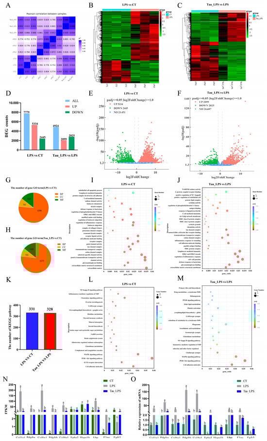 The potential mechanism of taurine in LPS-induced endometritis in mice was analyzed by RNA-seq. (A) Heat map of correlation between groups. (B,C) Clustering heatmap of DEGs in differential comparison groups. (D) Counts of DEGs in differential comparison groups. (E,F) Volcano plots of DEGs. (G–J) GO enrichment analysis of the DEGs quantity distribution chart and bubble chart. (K–M) Statistical chart and bubble chart of the KEGG pathway number of DEGs in the ovaries of mice in each group. (N,O) The FPKM values of part DEGs in each group were verified by qRT-PCR. Values were represented as mean ± SEM. No identical letter on top of the bar showed a remarkable difference (p < 0.05). CT: control group; LPS: LPS group; Tau_LPS: 100 mg/kg taurine + LPS group.