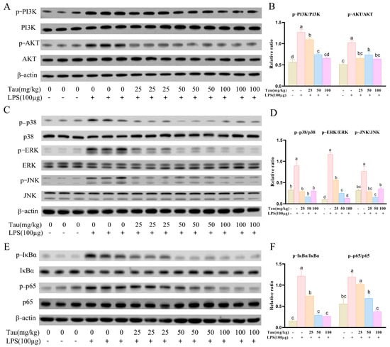To further validate the roles of PI3K-Akt/MAPK/NF-κB signaling pathway in taurine modulating mice endometritis, related protein expressions were determined. It was shown that p-PI3K and p-Akt protein levels increased (p < 0.05) in the uterus tissues with LPS treatment, and decreased (p < 0.05) by taurine intervention (Figure 6A,B). Similarly, phosphorylation levels of p38 mitogen-activated protein kinase (p38), extracellular signal-regulated kinase (ERK), and c-Jun N-terminal kinase (JNK) in the MAPK pathway and phosphorylation levels of inhibitor of kappa B alpha (IκBα) and nuclear factor NF-κB p65 subunit (p65) in the NF-κB pathway were enhanced (p < 0.05) with LPS treatment compared to the control group. However, the phosphorylation status of p38, ERK, JNK, p65, and IκBα were inhibited (p < 0.05) by 25, 50, and 100 mg/kg of taurine treatment (Figure 6C–F).