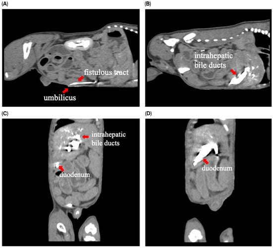 To assess for a persistent urachus, a positive contrast cystogram (KXO-80s, Toshiba, Tokyo, Japan) was performed using iohexal contrast medium (10 mL/kg, diluted to 100 mg I/mL; Omnipaque, GE HealthCare, Bangkok, Thailand). The cystogram demonstrated a contrast-filled structure extending from the apex of the urinary bladder as a convex outpouching of the lumen without evidence of contrast leakage toward the umbilicus (Figure 2). These findings were considered consistent with vesicourachal diverticula. An abdominal ultrasound examination was performed by using a real-time scanner (LOGIQ E9, GE, Fairfield, CT, USA) with a 13 MHz broadband linear transducer. Abdominal ultrasonography revealed a markedly dilated common bile duct (CBD; diameter 0.45 cm) and found an abnormal fistulous tract extending toward the umbilical region, while the gallbladder was not visualized (Figure 3). These findings raised the suspicion of an anomalous extrahepatic biliary tract or an ectopic remnant ductal structure. Therefore, an abdominal computed tomography (CT) scan (Optima 660, GE HealthCare, Bangkok, Thailand) with fistulogram was performed under general anesthesia (induction: propofol [8 mg/kg IV, Troypofol, Troikaa Pharmaceuticals Ltd., Gujarat, India], maintenance: 3% sevoflurane inhalation [Sevo, Singapore Pharmawealth Lifesciences Inc., Laguna, Philippines]). Iohexal contrast medium (2 mL/kg, 300 mg I/mL) was injected via a feeding tube inserted through the umbilicus. The fistulogram demonstrated a tubular tract filled with contrast medium extending from the umbilicus to the CBD and biliary tree, with passage of contrast into the duodenum (Figure 4). The CBD was dilated with contrast medium. In addition, CT imaging revealed the absence of the gallbladder, consistent with agenesis. Together, these findings were compatible with a congenital umbilicobiliary fistula with gall bladder agenesis. All the imaging techniques were performed and interpreted by a veterinary radiologist certified by the Thai Board of Veterinary Surgeons (sub-specialty of veterinary diagnostic imaging).