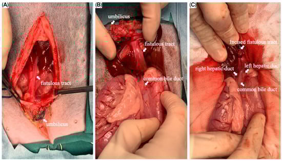 The puppy was taken for an exploratory laparotomy when aged 3 months old and weighing 3.8 kg. Generalized anesthesia was induced with slow IV infusion of propofol (4 mg/kg) and maintained with 3.6–5.3% inhalant sevoflurane. Preemptive antibiotic therapy with cefazolin (Cefaben®; 20 mg/kg, IV; L.B.S. Laboratory Co. Ltd., Bangkok, Thailand) was given. Morphine sulphate (0.2 mg/kg, IM; M&H Manufacturing Ltd., Samutprakarn, Thailand), fentanyl (1.5 mcg/kg, IV; Siam Bioscience Co., Ltd., Bangkok, Thailand), and fentanyl (10 µg/kg/h CRI) were used for analgesia. The ventral abdominal skin was routinely prepared for surgery. A single simple interrupted suture was placed around the opening of the bile duct at the umbilicus to prevent bile contamination of the surgical area. A standard midline celiotomy was performed by making an incision from the caudal of the umbilicus to the caudal of the abdomen, and cranial of the umbilicus to the xiphoid. A thin-walled fistulous tract that connected the umbilicus area to the CBD was identified (Figure 5A,B). The gallbladder was absent. An incision was made around the umbilicus to free the fistulous tract and the umbilical opening from the abdominal wall. Then, the fistula wall was dissected and separated from the hepatic fossa. The fistulous tract was ligated (polydioxanone 2-0, PDS™II, Ethicon, Johnson & Johnson MedTech (Thailand) Ltd., Bangkok, Thailand) and incised at the opening site near the CBD (Figure 5C). A total of three punch biopsy specimens were obtained from multiple liver lobes. Vesicourachal diverticula and a thin fibrous band connecting the ventro-cranial portion of the bladder to the midline of the abdominal wall at the umbilical area were identified. (Figure 6A). The urinary bladder had a small convex pouch at the apex (Figure 6A,B). The diverticulum and the thin ligament on the urinary bladder were excised. Urinary bladder wall reconstruction was performed using a simple interrupted suture (polydioxanone 4-0). The abdominal wall was closed with the standard procedure.
