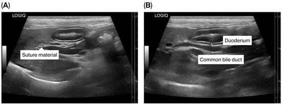 The puppy’s anesthetic recovery went well. Intravenous fluid therapy using 0.9% NaCl (General Hospital Products Public Co., Ltd., Pathum Thani, Thailand) and antibiotic therapy using cefazolin intravenously (20 mg/kg q12h) were continued for postoperative care. Tramadol (2.5 mg/kg q12h, IV; Tramada-100®, L.B.S. Laboratory Ltd., Part., Bangkok, Thailand) was administered for analgesia. Upon recovery, the puppy was bright with a good appetite. The puppy was discharged 72 h after surgery with an uneventful postoperative recovery, and the sutures were removed seven days later. At three months post-operation, ultrasonography demonstrated a smaller size of the CBD (diameter 0.35 cm) (Figure 7A,B). The dog remained clinically healthy without any relevant complications for 19 months post-operation. Unfortunately, the dog died at the age of 1 year 10 months due to aspiration pneumonia of unknown cause.