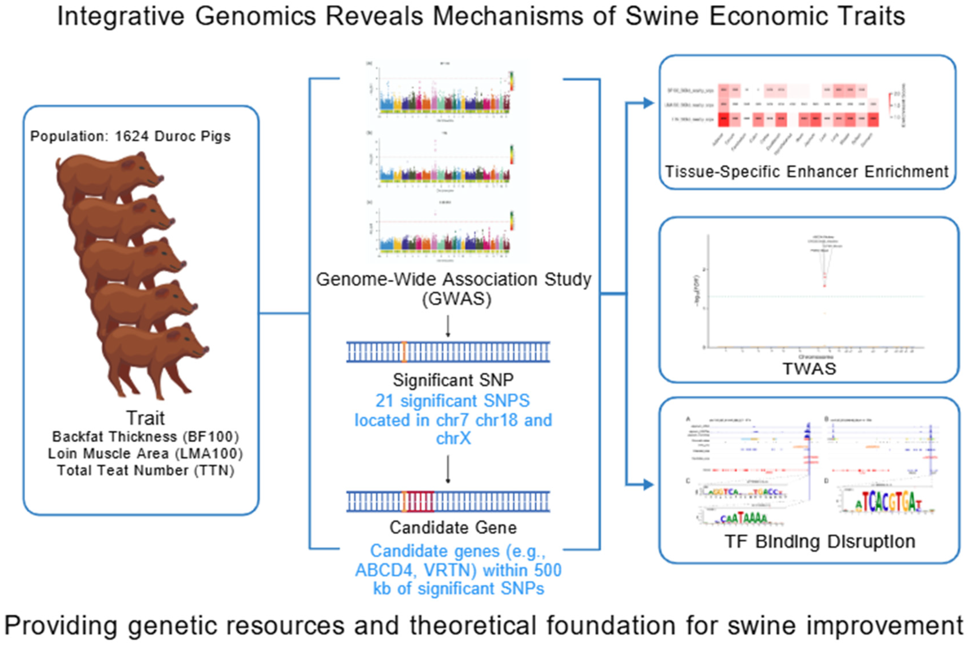 Yan, Z.; Li, X.; Yang, W.; Zhou, P.; Zhang, W.; Li, X.; Fu, L.; Li, J.; Du, X. Integrative Multi-Omics Analysis Unveils Candidate Genes and Functional Variants for Growth and Reproductive Traits in Duroc Pigs. Animals 2025, 15, 3627. https://doi.org/10.3390/ani15243627