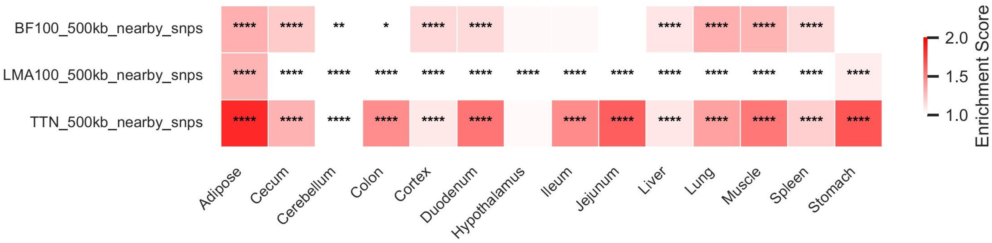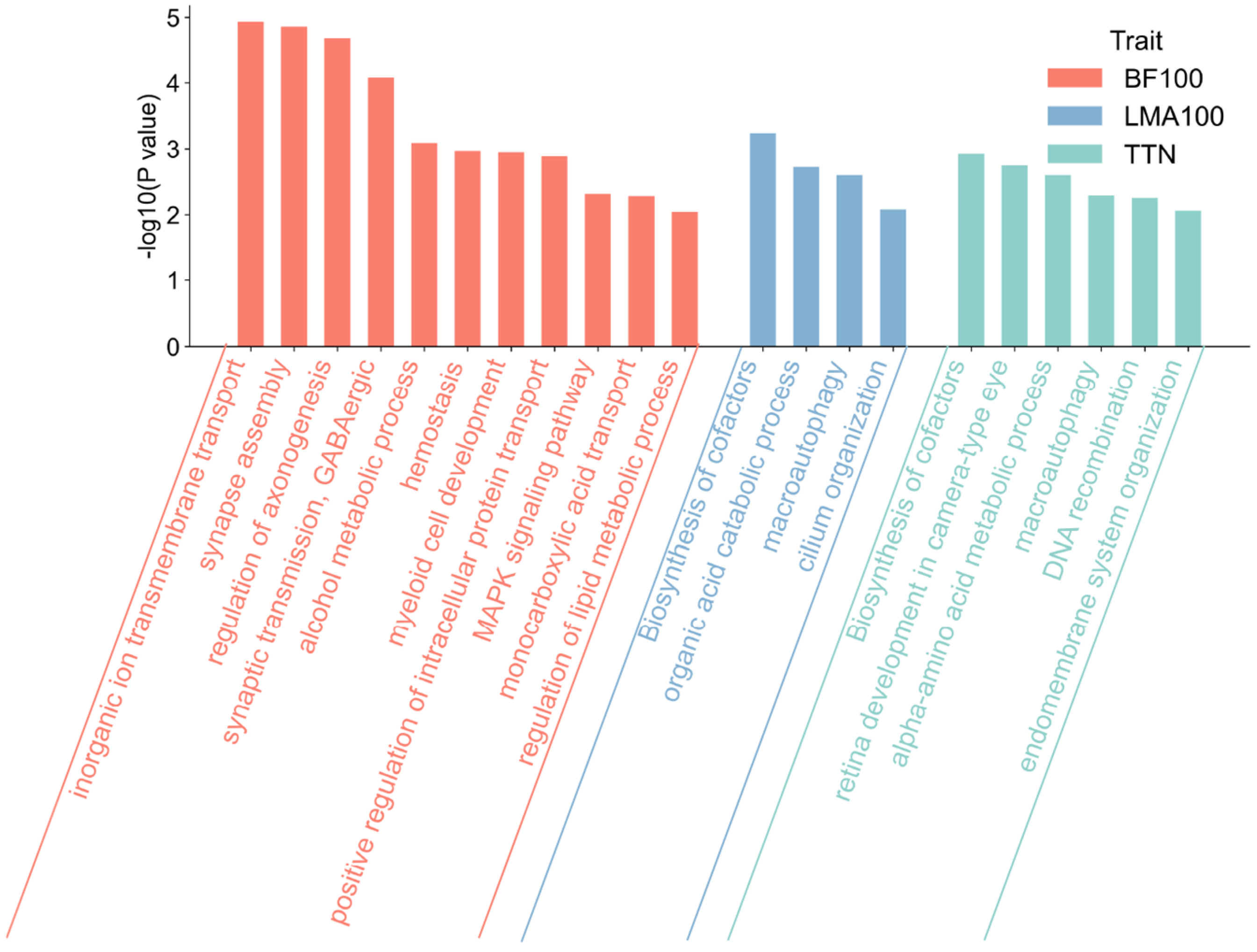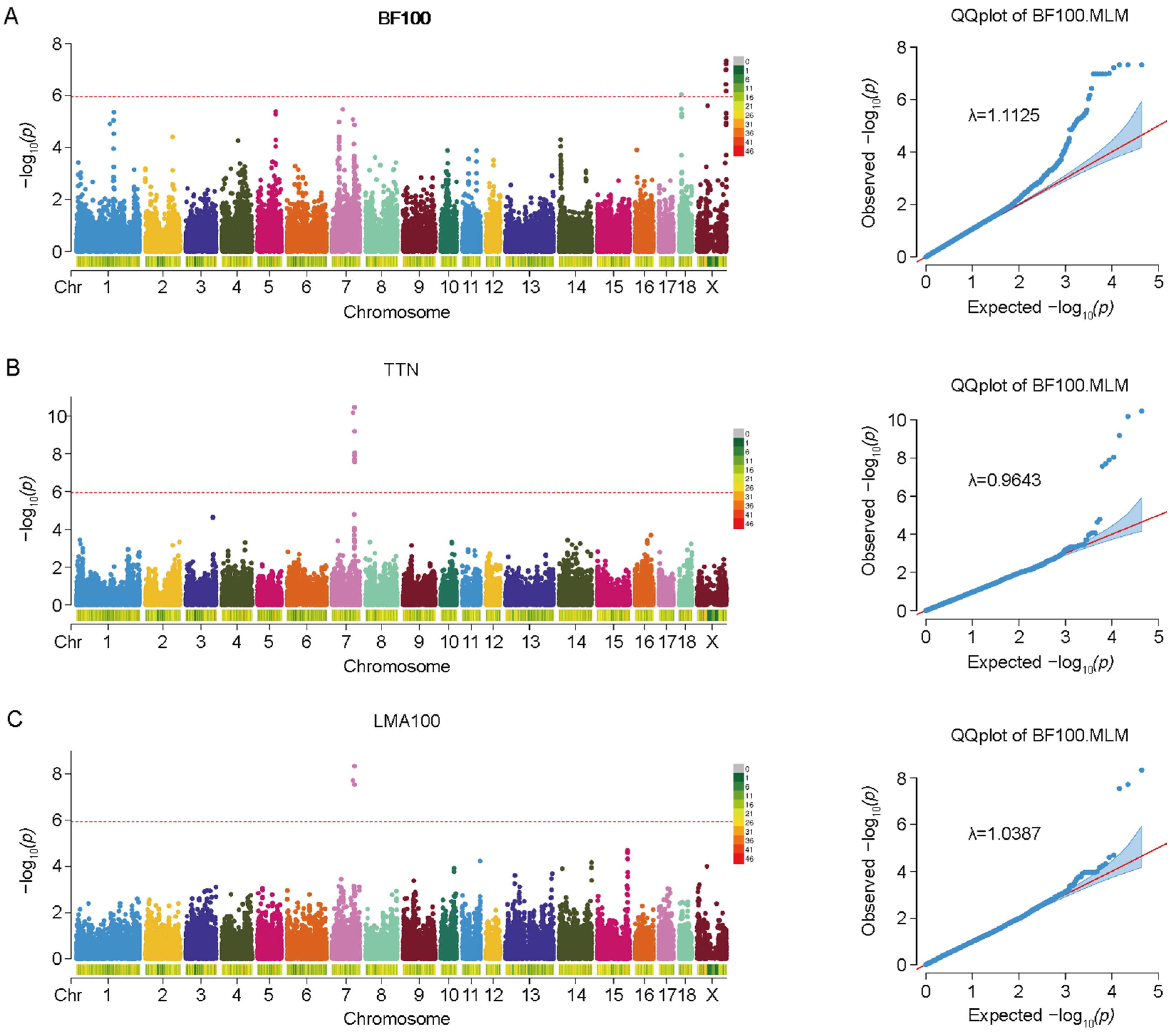 3.2. Genome-Wide Association Analysis (GWAS) of BF100, LMA100, and TTN