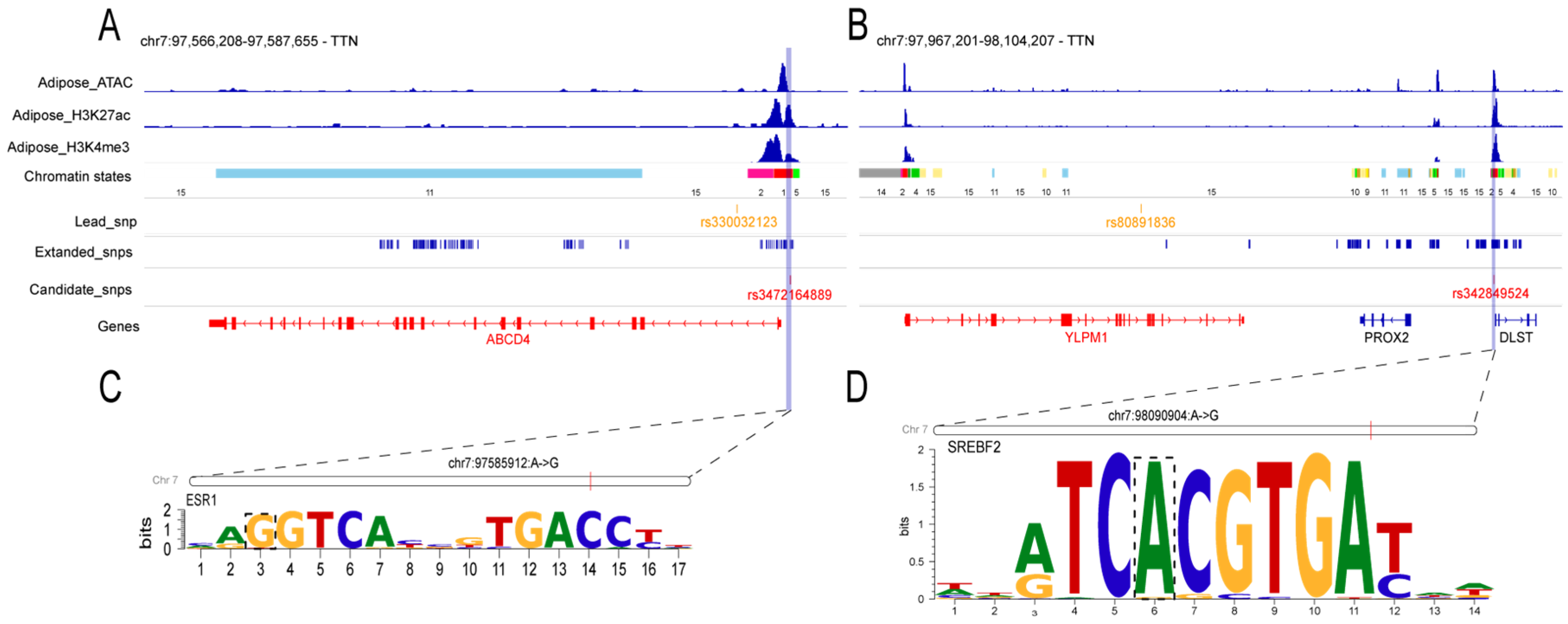 | TTN | rs81396056 | 7 | 97732109 | 1.95 × 10−8 | ABCD4/NPC2/VRTN/SYNDIG1L/LTBP2/AREL1/YLPM1/PROX2/DLST |