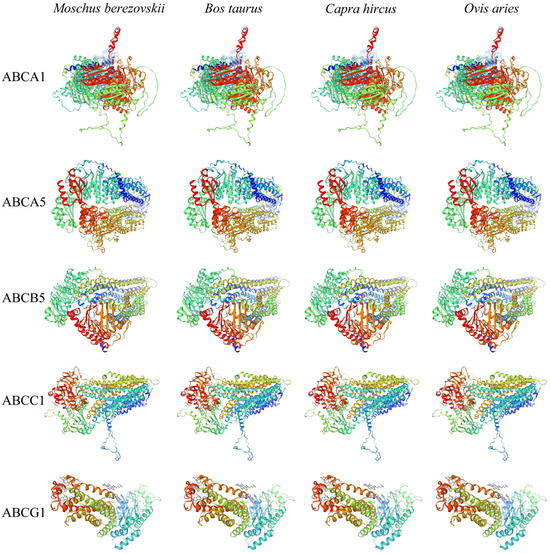The secondary structure prediction (Table S4) indicates that alpha helix structure accounts for the largest proportion, ranging from 62.03% (MbABCA13) to 38.73% (MbABCE1). The second most abundant structure is the random coil, with a proportion ranging from 41.41% (MbABCG4b) to 23.57% (MbABCB9). This indicates that alpha helix and random coils play a major role in the formation of the tertiary structure of FMD. Homology modeling is an important technique in structural biology [39]. To gain insight into the structural characteristics of the MbABC proteins, we selected one protein from each group of FMD, cattle, goat, and sheep. Then, we generated a three-dimensional protein model using SWISS-MODEL. The results showed that ABCA1, ABCA5, ABCB5, ABCC1, and ABCG1 proteins had similar structures in different species (Figure 2). Collectively, the proteins from different species within the same subfamily exhibited considerable differences, whereas those from different subfamilies within the same species exhibited considerable differences. This result revealed the structural diversity of the ABC family in the four species. The study suggests that the ABC transporter family exhibits structural diversity among different species, further speculating that the gene-encoded structures of these proteins may be closely related to their biological functions.