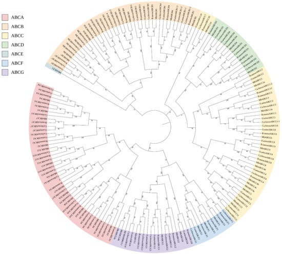 All available ABC transporter protein sequences of 40 B. taurus, 42 Ca. hircus, and 48 O. aries were retrieved from the NCBI database (https://www.ncbi.nlm.nih.gov/, accessed on 25 November 2025) and used for the phylogenetic analyses. The protein sequences were used in the phylogenetic tree which was analyzed using the Maximum Likelihood (ML) method based on bootstrap sampling in MEGA software (version 12), with a bootstrap method of 1000. The parameters were as follows: Jones–Taylor–Thornton (JTT) model; Gamma Distributed (G); partial deletion 95%; 1000 bootstrap replications. The phylogenetic tree was visualized using the Interactive Tree of Life (iToL) (https://itol.embl.de/, accessed on 30 November 2025).
