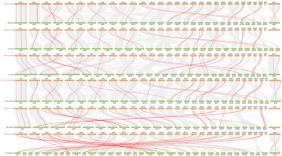 Collinearity analyses of the ABC gene family in FMD, B. taurus, O. aries, Ca. hircus, Bu. bubalis, B. grunniens, and Ce. elaphus. Each horizontal line represents a chromosome, and the numbers represent chromosome numbers. The red lines indicate collinear gene pairs.
