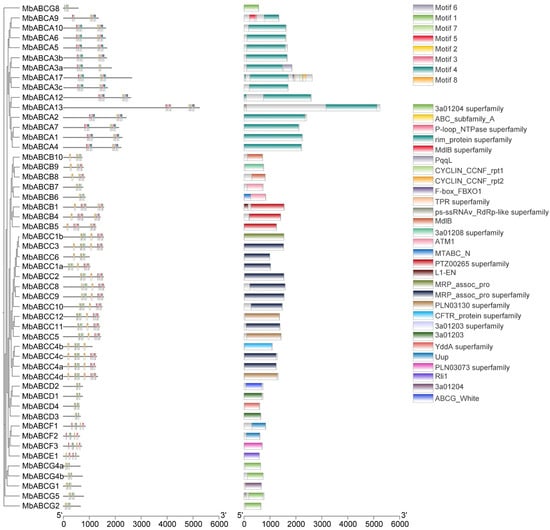 To characterize the putative motifs in MbABC proteins, we submitted the predicted amino acid sequences of the 51 MbABC proteins to the MEME website. The distribution of these motifs in MbABC is shown in Figure 5. To gain insight into the gene structure and evolutionary relationships among members of MbABC proteins (Figure 6 and Figure 7). The motif distribution patterns of MbABC proteins in the same subfamily were similar, indicating that these proteins may have similar functions. The number of conserved motifs in MbABC gene family varied from 3 to 8. Among them, Motif3, motif4, and motif8 was the longest at 50 amino acids, and Motif6, Motif1, Motif7, Motif5, and Motif2 having the highest frequency occurrence across all genes. Motif 6 and 1 were present in each subfamily, with the ABCA and ABCC subfamilies having high number of motifs. Exon–intron structure analysis revealed that MbABC genes have numerous exons. Overall, the organization of probably conserved motifs revealed a correlation with the distinct grouping of ABCs, which may be the cause of the functional specialization of MbABCs in various subfamilies.