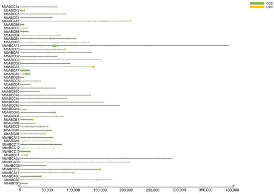 Gene structures analysis of MbABC proteins. Exons and UTR are denoted by green and yellow boxes.